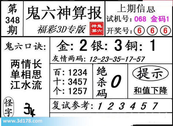 3d第17348期鬼六神算报为您推荐鬼六口诀: