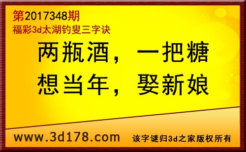 3d第17348期太湖字谜:两瓶酒,一把糖,想当年,娶新娘