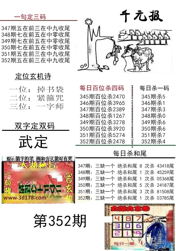 福彩3d布衣图库布衣千元报第2017352期定位玄机诗:福彩3d第2017352期布衣千元报图详情分析如下:一位:掉书袋二位:紧箍咒三位:一字师每日百位杀四码:2478每日杀一码:4每日杀和尾:三缺一个 决杀和尾1 次杀0 3 7 8 5尾布衣图库由3d之家3d图库频道原创,仅供彩民参考,温馨提供。