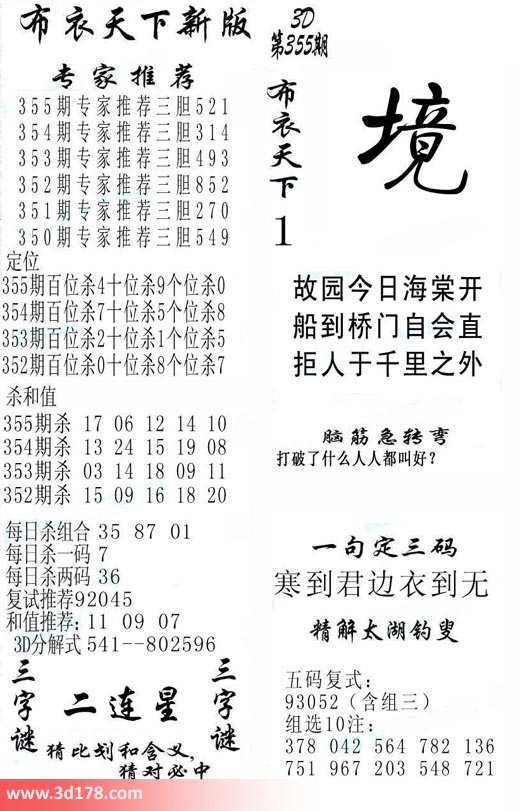 福彩3d第2017355期福彩3d布衣天下新版: