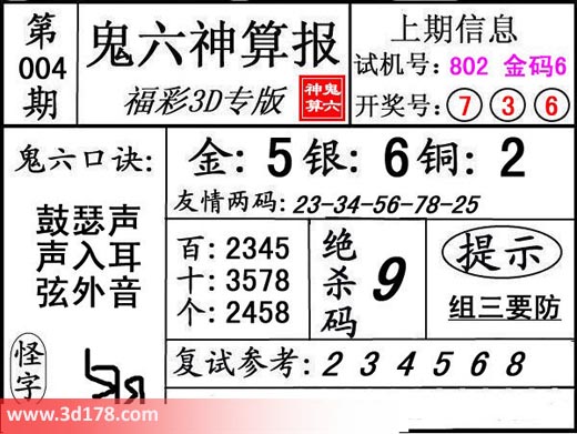 3d第18004期鬼六神算报为您推荐鬼六口诀:
