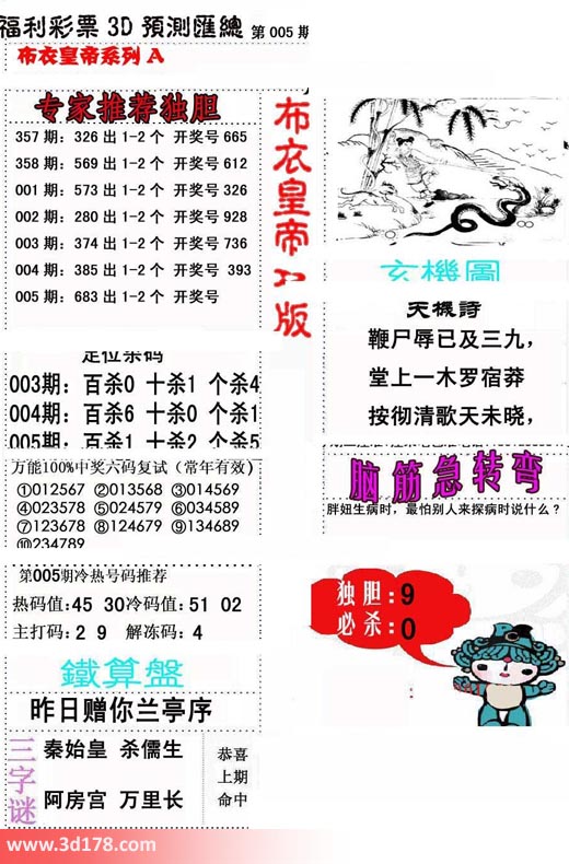 福彩3d第2018005期布衣皇帝A版布衣专家独家推荐:
