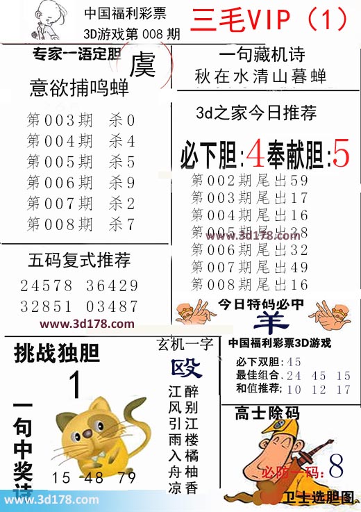 福彩3d第2018008期三毛VIP:3d第2018008期三毛VIP详解:一句藏机诗:秋在水清山暮蝉第2018008期挑战独胆:1必下胆:4 奉献胆:5五码复式推荐:24578 36429 32851 03487今日特码必中:羊最佳组合:24 45 15和值推荐:10 12 17玄机一字:殴一句中奖诗:醉别江楼橘柚香,江风引雨入舟凉该三毛玄机解码图由3d之家3d图库频道原创,仅供彩民参考,温馨提供。
