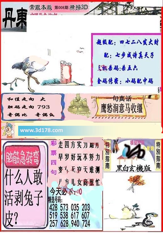 3d之家第2018008期丹东快报图:3d第2018008期丹东快报图详解:天机杀码:杀五六和值走向:大胆码走向:793奇偶比:1:2金码传密:小码配中码精选号码:428 573 035 203 519 538 617 607 257 628 940 724脑筋急转弯:什么人敢活剥兔子皮?该丹东图库由3d之家3d图库频道原创,仅供彩民参考,温馨提供。