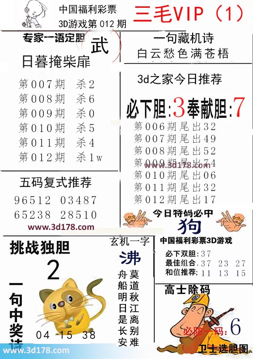 福彩3d第2018012期三毛VIP:3d第2018012期三毛VIP详解:一句藏机诗:白云愁色满苍梧第2018012期挑战独胆:2必下胆:3 奉献胆:7五码复式推荐:96512 03487 65238 28510今日特码必中:狗最佳组合:37 23 27和值推荐:11 13 15玄机一字:沸一句中奖诗:莫道秋江离别难,舟船明日是长安该三毛玄机解码图由3d之家3d图库频道原创,仅供彩民参考,温馨提供。