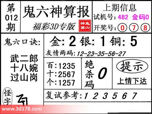 3d第18012期鬼六神算报为您推荐鬼六口诀: