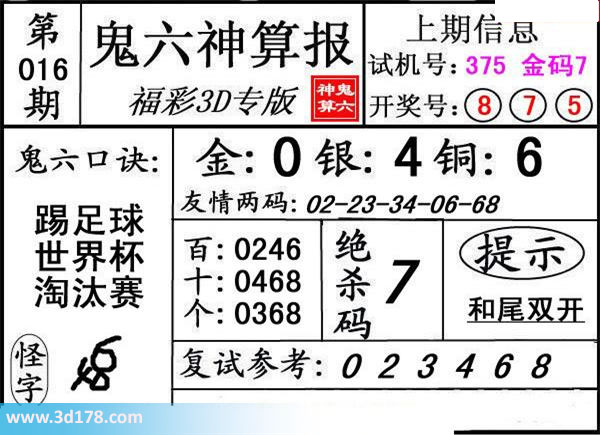 3d第18016期鬼六神算报为您推荐鬼六口诀: