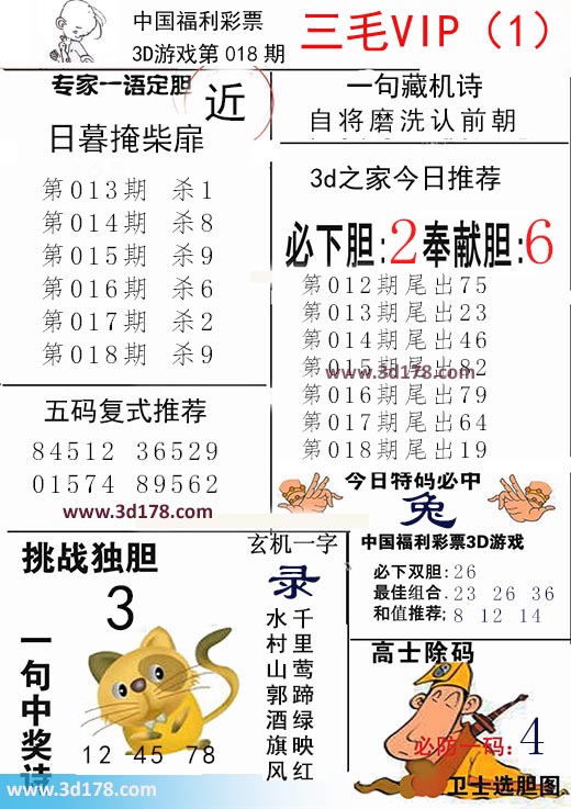 福彩3d第2018018期三毛VIP:3d第2018018期三毛VIP详解:一句藏机诗:自将磨洗认前朝第2018018期挑战独胆:3必下胆:2 奉献胆:6五码复式推荐:84512 36529 01574 89562今日特码必中:兔最佳组合:23 26 36和值推荐:8 12 14玄机一字:录一句中奖诗:千里莺蹄绿映红,水村山郭酒旗风该三毛玄机解码图由3d之家3d图库频道原创,仅供彩民参考,温馨提供。