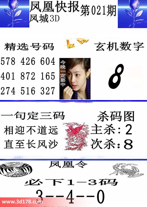 3d第2018021期凤凰快报内容解析:玄机数字:8精选号码:578 426 604 401 872 165 274 516 327一句定三码:相迎不道远,直至长风沙杀码图:主杀:2 次杀:8凤凰令:必下1-3码 3--4--0该凤凰快报图库由3d之家3d图库频道原创,仅供彩民参考,温馨提供。