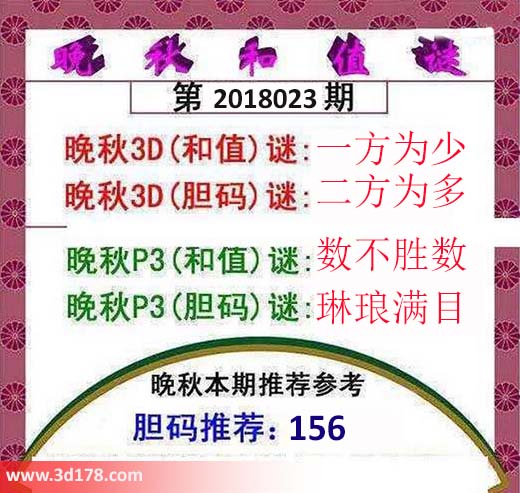 晚秋3D(和值)谜:一方为少