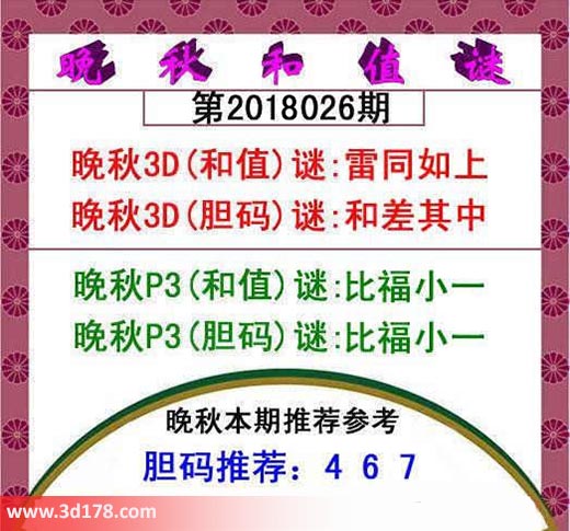福彩3d红五晚秋图第18026期3d推荐:3d之家3d红五晚秋图第2018026期为您推荐分析:晚秋3D(和值)谜:雷同如上晚秋3D(胆码)谜:和差其中晚秋p3(和值)谜:比福小一晚秋p3(胆码)谜:比福小一胆码推荐:467该红五图库由3d之家3d图库频道原创,仅供彩民参考,温馨提供。