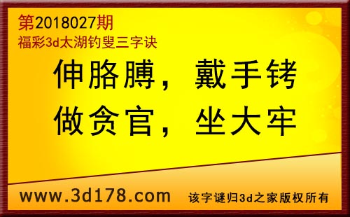 3d第18027期太湖字谜:伸胳膊,戴手铐,做贪官,坐大牢