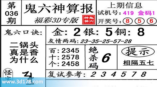 3d第18036期鬼六神算报为您推荐鬼六口诀:本期3d鬼六图库精解如下:复式参考:234578金胆:2,银胆:5,铜胆:8定位复式:百位:2345十位:2578个位:2458绝杀码:6友情两码:23-35-25-57-28该鬼六图库由3d之家3d图库频道原创,仅供彩民参考,温馨提供。