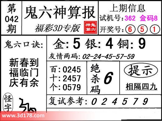 3d第18042期鬼六神算报为您推荐鬼六口诀: