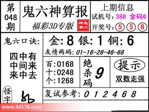 3d第18048期鬼六神算报为您推荐鬼六口诀: