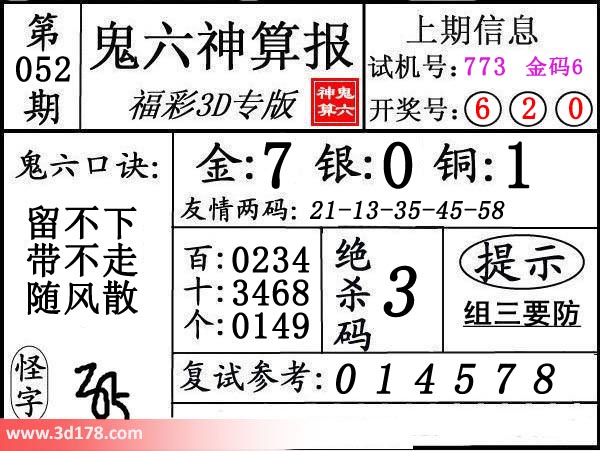 3d第18052期鬼六神算报为您推荐鬼六口诀: