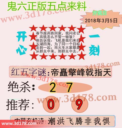 福彩3d第2018057期鬼六五点来料:3d鬼六五点来料详解第2018057期:红五字谜: 帝矗擎峰戟指天绝杀:2 7两胆码推荐:0 9内幕玄机诗:潮洪飞腾非我惧该鬼六图库由3d之家3d图库频道原创,仅供彩民参考,温馨提供。