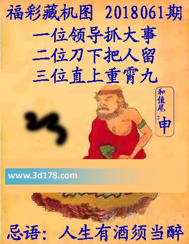 福彩3d第2018061期正版藏机图详解:3d之家3d藏机图第18061期本期为您详细解答:一位领导抓大事二位刀下把人留三位直上重霄九和尾:申忌语:人生有酒须当醉3d正版藏机图由3d之家3d图库频道原创,仅供彩民参究底考,温馨提供。