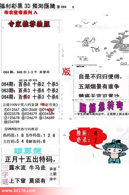 福彩3d第2018064期布衣皇帝A版布衣专家独家推荐: