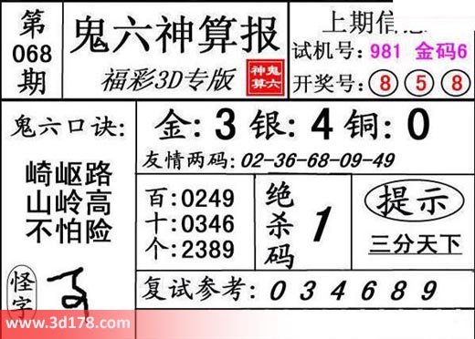 3d第18068期鬼六神算报为您推荐鬼六口诀: