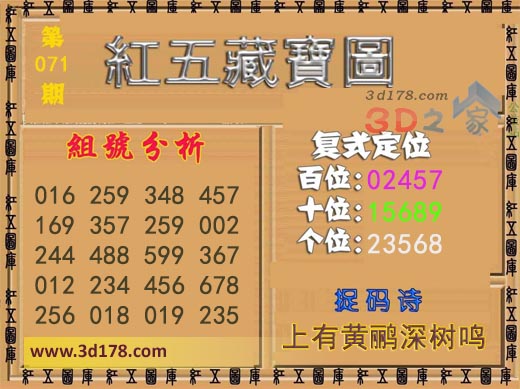 红五藏宝图3d第2018071期:福彩3d第2018071期红五藏宝图:复式定位:百位:02457十位:15689个位:23568捉码诗:上有黄鹂深树鸣组号分析:016 259 348 457 169 357 259 002 244 488 599 367 012 234 456 678 256 018 019 235红五图库由3d之家3d图库频道原创,仅供彩民参考,温馨提供。