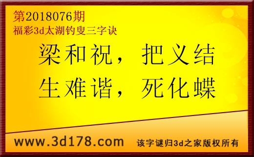 3d第18076期太湖字谜:梁和祝,把义结,生难谐,死化蝶。