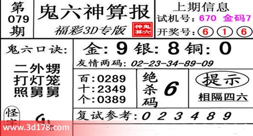 3d第18079期鬼六神算报为您推荐鬼六口诀: