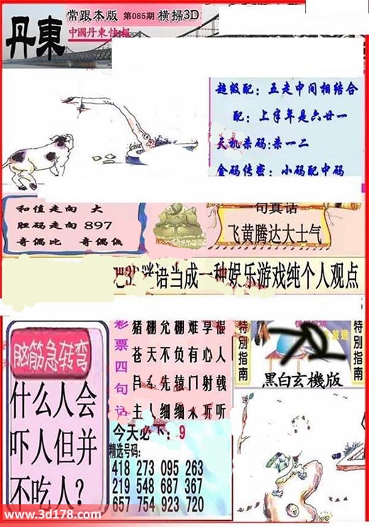 3d之家第2018085期丹东快报图:3d第2018085期丹东快报图详解:天机杀码:杀一二和值走向:大胆码走向:897奇偶比:1:2金码传密:小码配中码精选号码:418 273 095 263 219 548 687 367 657 754 923 720脑筋急转弯:什么人会吓人但并不吃人?该丹东图库由3d之家3d图库频道原创,仅供彩民参考,温馨提供。