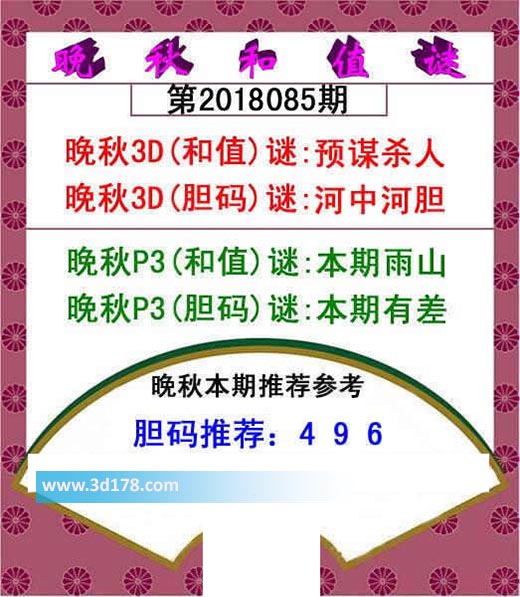 福彩3d红五晚秋图第18085期3d推荐:3d之家3d红五晚秋图第2018085期为您推荐分析:晚秋3D(和值)谜:预谋杀人晚秋3D(胆码)谜:河中河胆晚秋p3(和值)谜:本期雨山晚秋p3(胆码)谜:本期有差胆码推荐:496该红五图库由3d之家3d图库频道原创,仅供彩民参考,温馨提供。