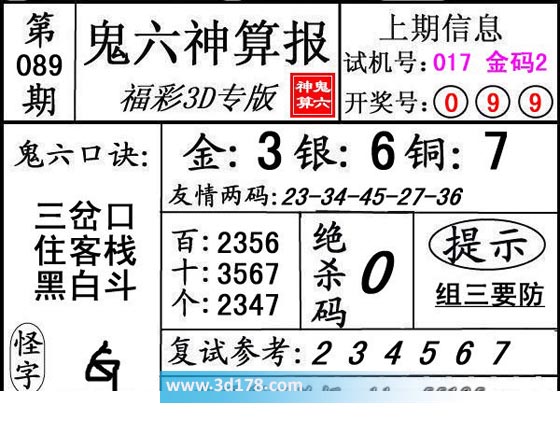 3d第18089期鬼六神算报为您推荐鬼六口诀: