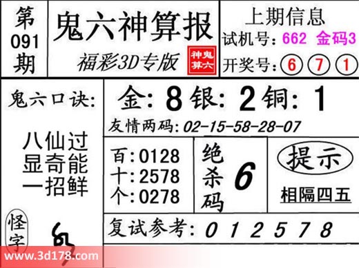 3d第18091期鬼六神算报为您推荐鬼六口诀: