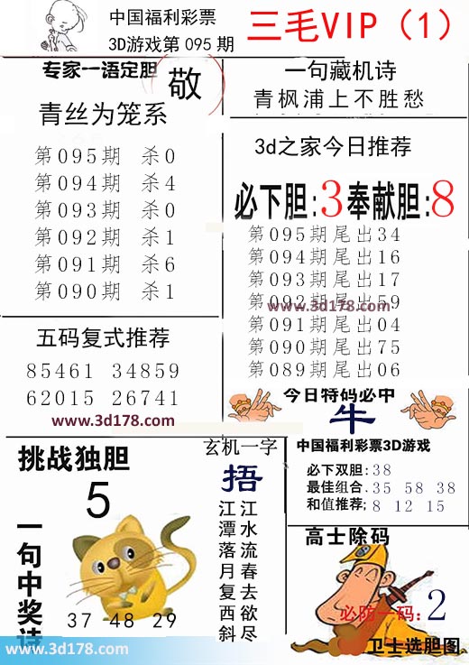 福彩3d第2018095期三毛VIP:3d第2018095期三毛VIP详解:一句藏机诗:青枫浦上不胜愁第2018095期挑战独胆:5必下胆:3 奉献胆:8五码复式推荐:85461 34859 62015 26741今日特码必中:牛最佳组合:35 58 38和值推荐:8 12 15玄机一字:捂一句中奖诗:江水流春去欲尽,江潭落月复西斜该三毛玄机解码图由3d之家3d图库频道原创,仅供彩民参考,温馨提供。