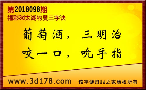 3d第18098期太湖字谜:葡萄酒,三明治,咬一口,吮手指福彩3d第2018098期太湖图库解析:葡萄酒——葡萄做的酒,解9有0;三明治——一种能吃的食物,有3防4;咬一口——用嘴巴咬一口,看0有1;吮手指——一个动作,解0看5;六码复式:013459精选10注:034 345 458 159 026 369 378 059 268 0693d太湖图库由3d之家3d图库频道原创,仅供彩民参考,温馨提供。