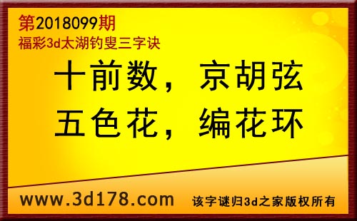 3d第18099期太湖字谜:十前数,京胡弦,五色花,编花环