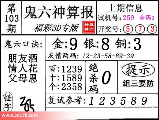 3d第18103期鬼六神算报为您推荐鬼六口诀:
