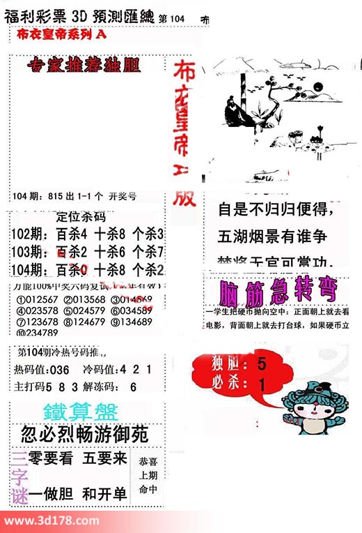 福彩3d第2018104期布衣皇帝A版布衣专家独家推荐: