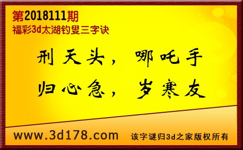 3d第18111期太湖字谜:刑天头,哪吒手,归心急,岁寒友福彩3d第2018111期太湖图库解析:刑天头——刑天的头是被皇帝斩掉的,解0防9;哪吒手——哪吒的手上用莲藕做成的,有1看2;归心急——归家的心非常的急,看0解1;岁寒友——长久以来的亲友,解1有9;六码复式:012359精选10注:012 129 029 019 234 468 257 169 378 0153d太湖图库由3d之家3d图库频道原创,仅供彩民参考,温馨提供。