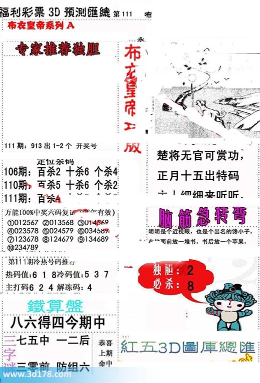 福彩3d第2018111期布衣皇帝A版布衣专家独家推荐:3d之家布衣皇帝第111期详解:111期:913 出1-2个 开奖号定位杀码:百位杀4 十位杀7 个位杀5第111期冷热号码推荐:热码值:6 1 8冷码值:5 3 7主打码:6 2 4解冻码:4天机诗:楚将无官可赏功正月十五出特码主人细细来听听铁算盘:八六得四今期中三字谜:七五中,一二后,三零前,防组六该布衣图库由3d之家3d图库频道原创,仅供彩民参考,温馨提供。