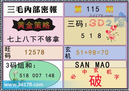 福彩3d第18115期三毛内部密报综合推荐如下: