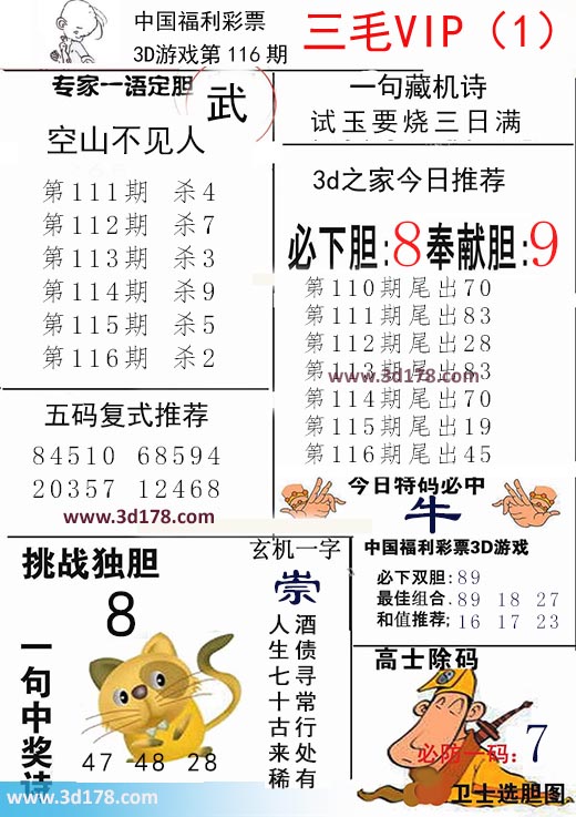 福彩3d第2018116期三毛VIP:3d第2018116期三毛VIP详解:一句藏机诗:试玉要烧三日满第2018116期挑战独胆:8必下胆:8 奉献胆:9五码复式推荐:84510 68594 20357 12468今日特码必中:牛最佳组合:89 18 27和值推荐:16 17 23玄机一字:崇一句中奖诗:酒债寻常行处有,人生七十古来稀该三毛玄机解码图由3d之家3d图库频道原创,仅供彩民参考,温馨提供。