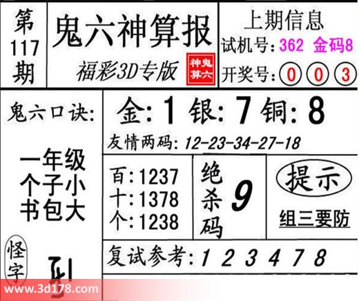 3d第18117期鬼六神算报为您推荐鬼六口诀: