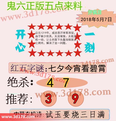福彩3d第2018120期鬼六五点来料:3d鬼六五点来料详解第2018120期:红五字谜:七夕今宵看碧霄绝杀:4 7两胆码推荐:3 9内幕玄机诗:试玉要烧三日满该鬼六图库由3d之家3d图库频道原创,仅供彩民参考,温馨提供。