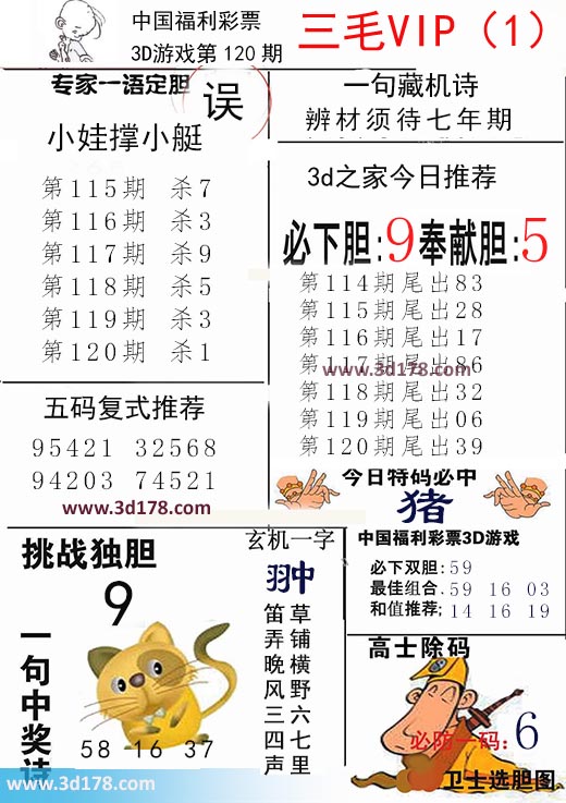 福彩3d第2018120期三毛VIP:3d第2018120期三毛VIP详解:一句藏机诗:辨材须待七年期第2018120期挑战独胆:9必下胆:9 奉献胆:5五码复式推荐:95421 32568 94203 74521今日特码必中:猪最佳组合:59 16 03和值推荐:14 16 19玄机一字:翀一句中奖诗:草铺横野六七里,笛弄晚风三四声该三毛玄机解码图由3d之家3d图库频道原创,仅供彩民参考,温馨提供。