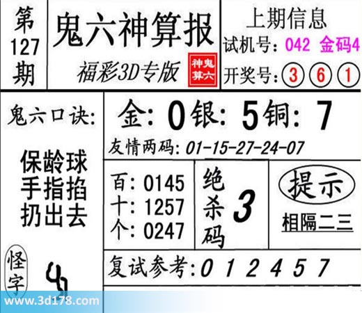3d第18127期鬼六神算报为您推荐鬼六口诀:
