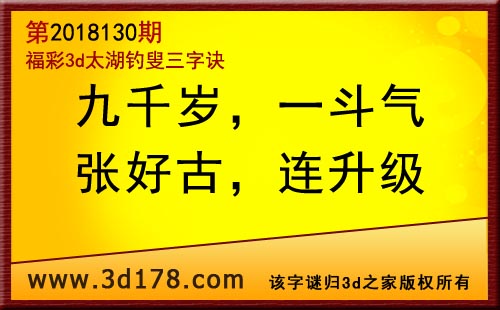 3d第18130期太湖字谜:九千岁,一斗气,张好古,连升级