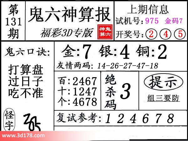 3d第18131期鬼六神算报为您推荐鬼六口诀: