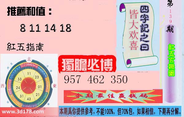第18139期3d红五图为您推荐:福彩3d第2018139期红五玄机图详细内容:推荐和值:8 11 14 18独胆必博:957 462 350四字记之曰:皆大欢喜该红五图库由3d之家3d图库频道原创,仅供彩民参考,温馨提供。