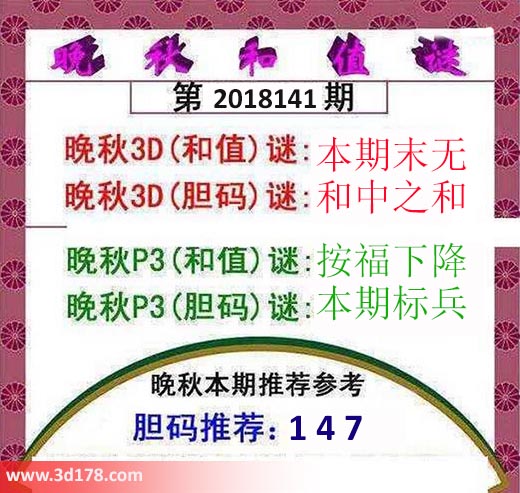 晚秋p3(和值)谜:按福下降