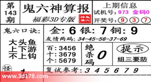 3d第18143期鬼六神算报为您推荐鬼六口诀: