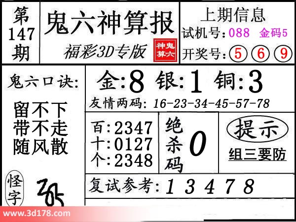 3d第18147期鬼六神算报为您推荐鬼六口诀: